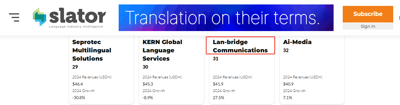 Slator作為全球語言技術(shù)服務(wù)領(lǐng)域最具公信力的研究平臺之一,每年基于企業(yè)營收規(guī)模、技術(shù)投入、客戶覆蓋度等20余項指標,對全球語言服務(wù)商進行綜合排名。其榜單數(shù)據(jù)均通過企業(yè)提交的審計財報及公開資料交叉驗證,被CSA Research、GALA等國際組織廣泛引用。